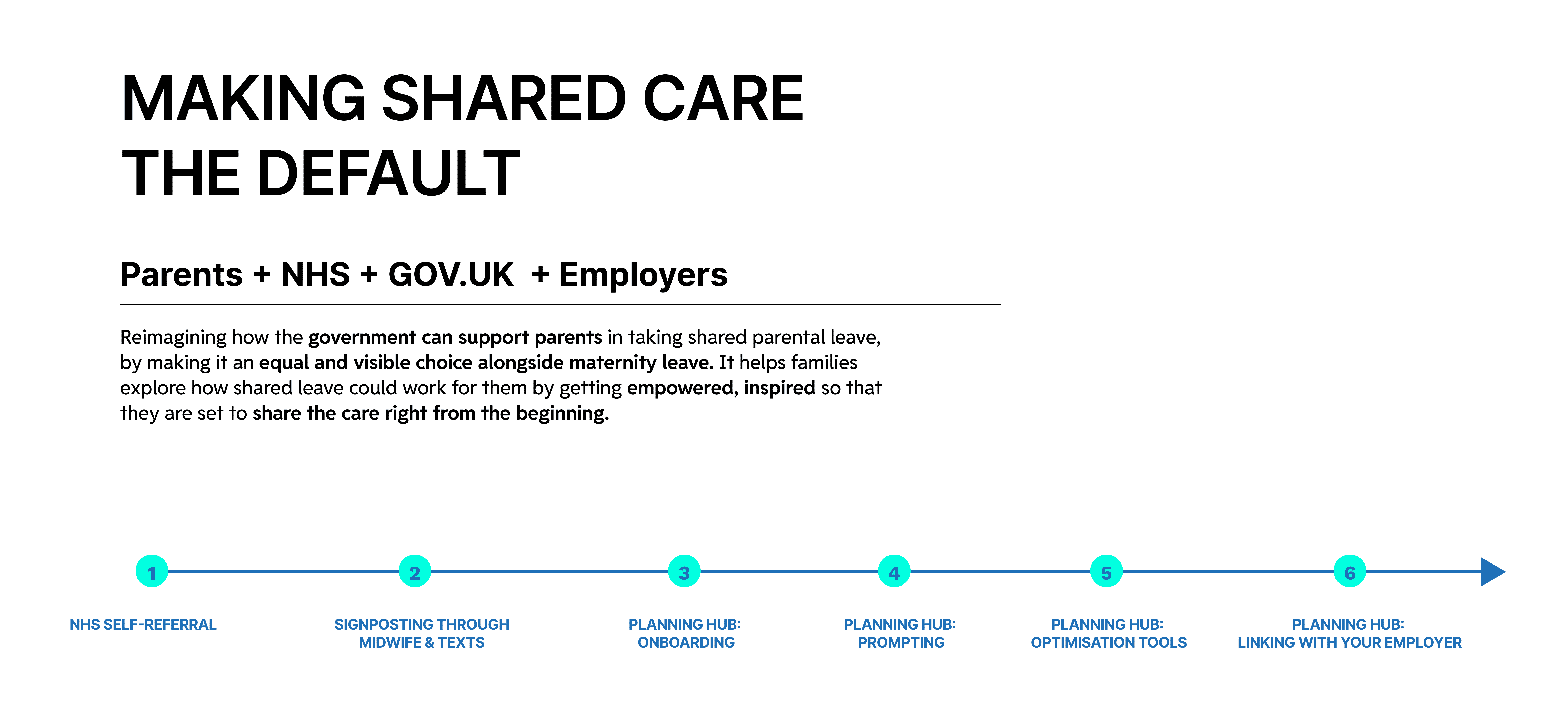 Me and my team looked into how Service Design can challenge traditional gender norms around caregiving in the UK by increasing the uptake of underused SPL policy. The intervention aims to normalize shared caregiving by making it a visible, accessible, and supported choice. We have reimagined how government services engage with families, helping them to make more informed, intentional decisions and empowering them to advocate for shared care from the very beginning.