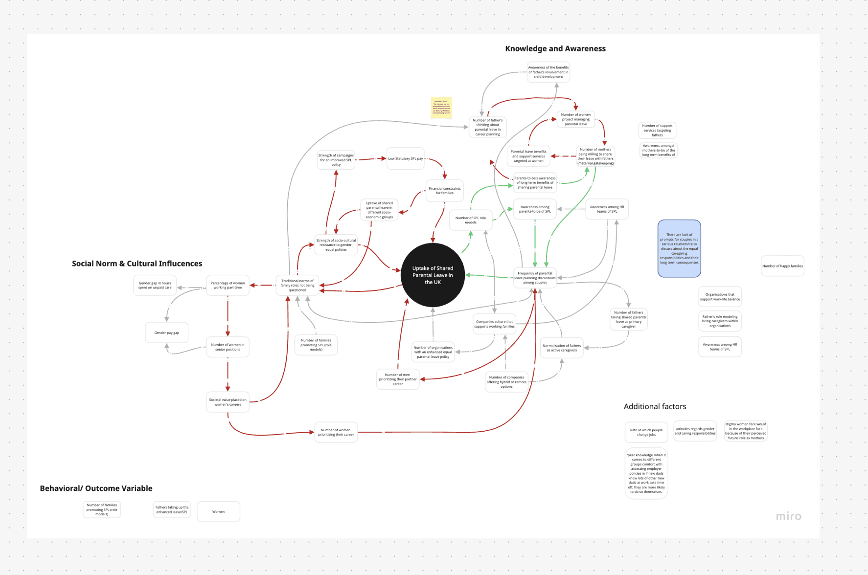 Synthesising qualitative and quantitative research revealed the Shared Parental Leave (SPL) ecosystem as a complex system shaped by multiple interconnected actors and structural barriers. To make sense of this, I developed a systems map that visualised the relationships between key stakeholders identified through research– including parents-to-be, parents who had taken SPL, employers, government bodies, the NHS, and antenatal classes.