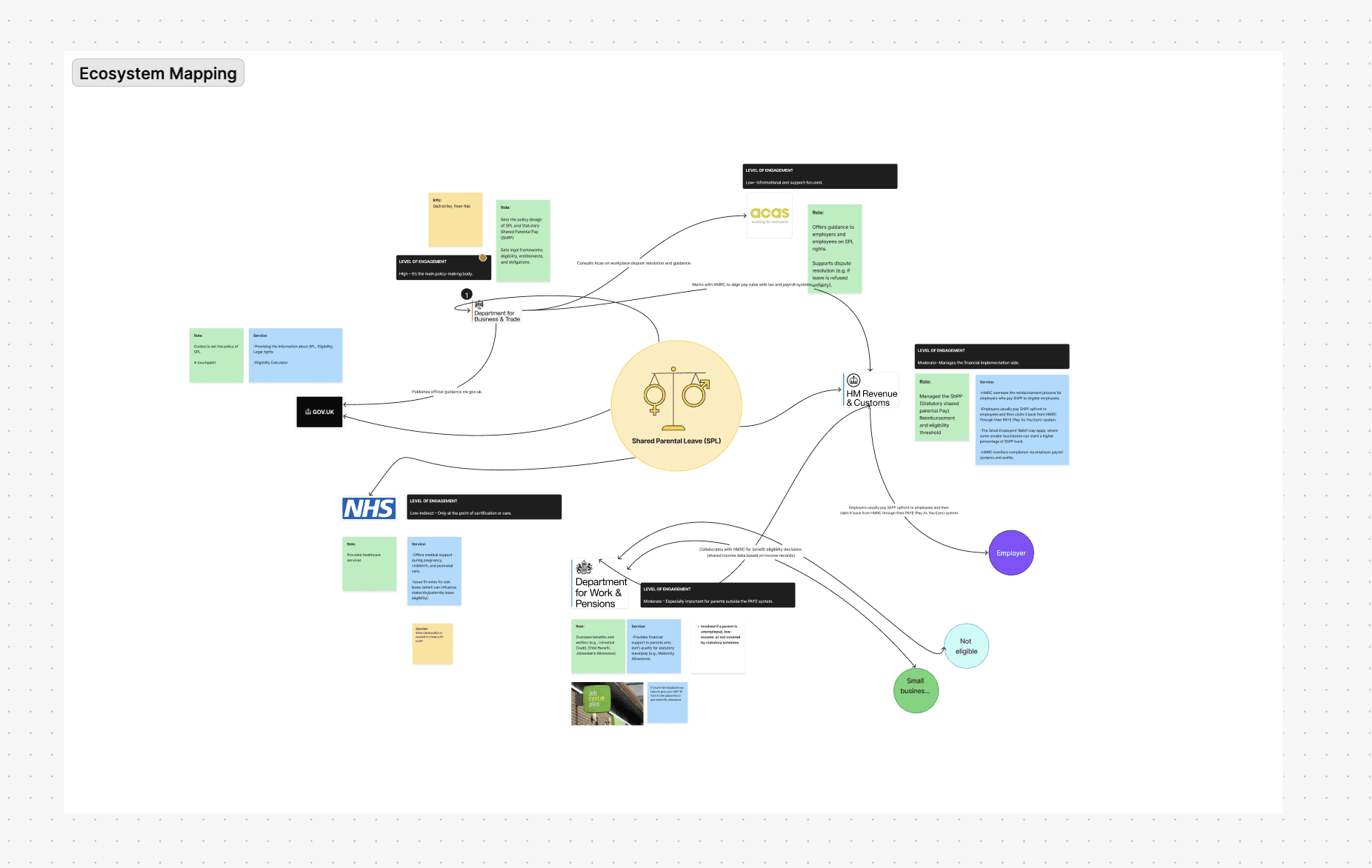 I mapped the current ecosystem to analyse the Shared Parental Leave (SPL) system at a strategic level by identifying relevant government departments and key stakeholders. This helped team understand roles, influence, and decision-making authority across the ecosystem, as well as the degree and capacity of government involvement at different stages of the service.
