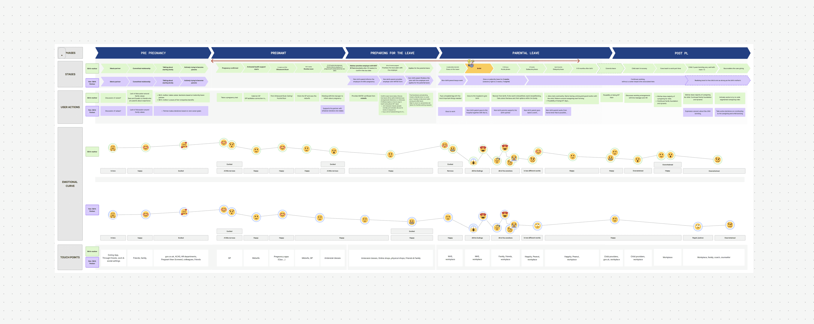 Interestingly, I combined the journey of birth mother and non-birthing partner which helped team discover how the system lacks the engagement of non-birthing partner at multiple touchpoints in the journey which supports the maternity leave route.