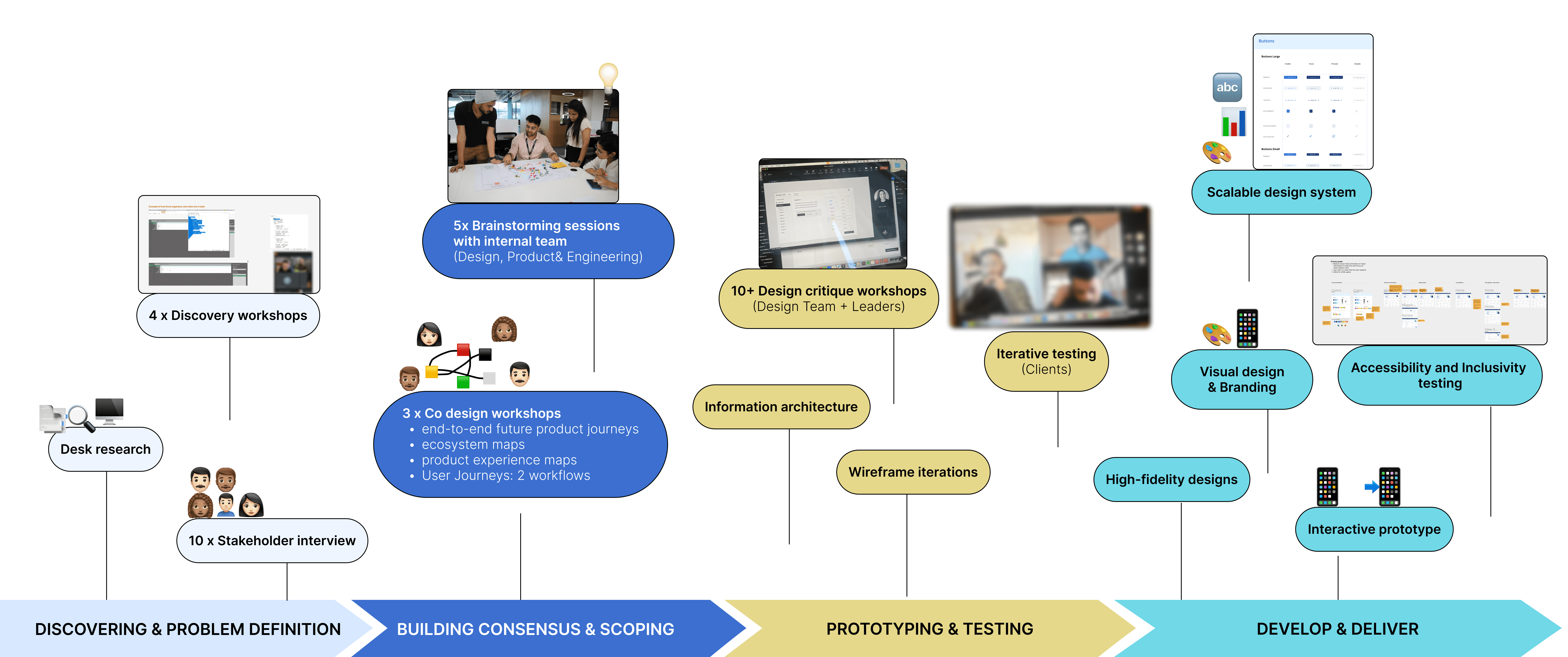 Final delivery included an end-to-end product experience map, an inclusive and WCAG-compliant scalable design system, detailed interactive prototypes, and a visual brand developed from scratch.